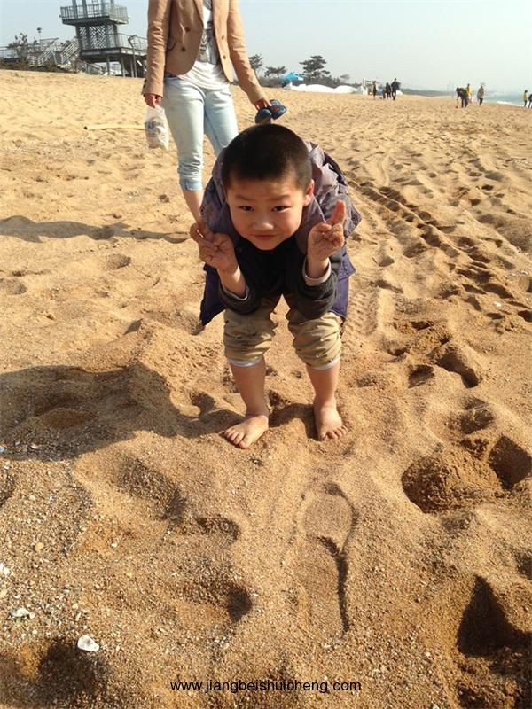 你看那個(gè)小男孩兒,被海浪打上來(lái)了吧,還是老實(shí)點(diǎn)兒玩沙子吧