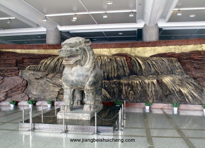 博物館序言廳位于中央大殿前端,陳列一尊巨大的千年石獅(唐代順陵石獅復(fù)制品),襯以奔騰的黃河和黃土高原巨幅照片,引導(dǎo)我們?nèi)ヮI(lǐng)略由黃土、黃河孕育出的古老文明。