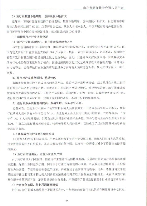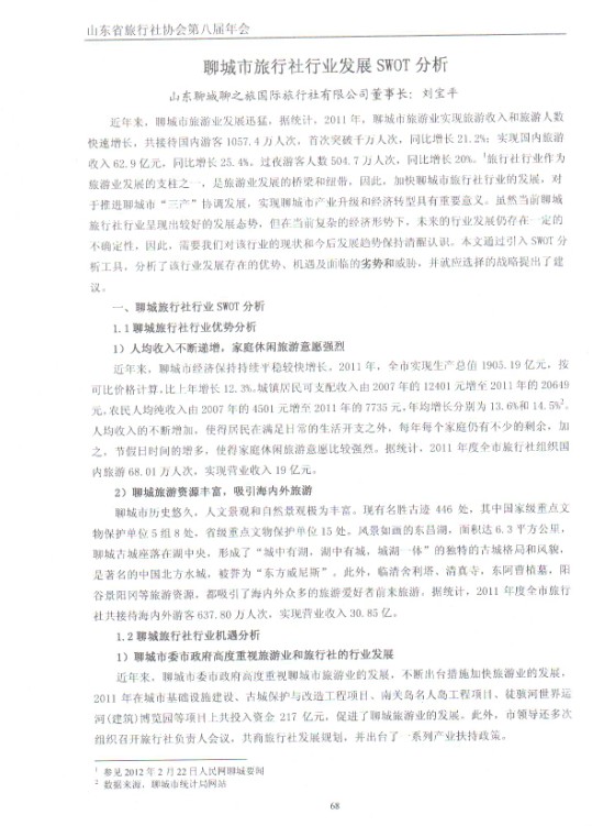 【網(wǎng)宣部】山東省旅行社協(xié)會2012年12月特刊發(fā)表全國優(yōu)秀導游員/聊之旅國際旅行社董事長劉寶平文章《聊城市旅行社行業(yè)發(fā)展SWOT分析》,文章指出雖然當前聊城旅行社行業(yè)呈現(xiàn)出較好的發(fā)展態(tài)勢,但在當前復雜的經(jīng)濟形勢下,未來的行業(yè)發(fā)展仍存在一定的不確定性,因此,需要我們對該行業(yè)的現(xiàn)狀和今后發(fā)展趨勢保持清醒認識,文章通過引入SWOT分析工具,分析了該行業(yè)發(fā)展存在的優(yōu)勢、機遇及面臨的劣勢和威脅,并就應選擇的戰(zhàn)略提出了建議。