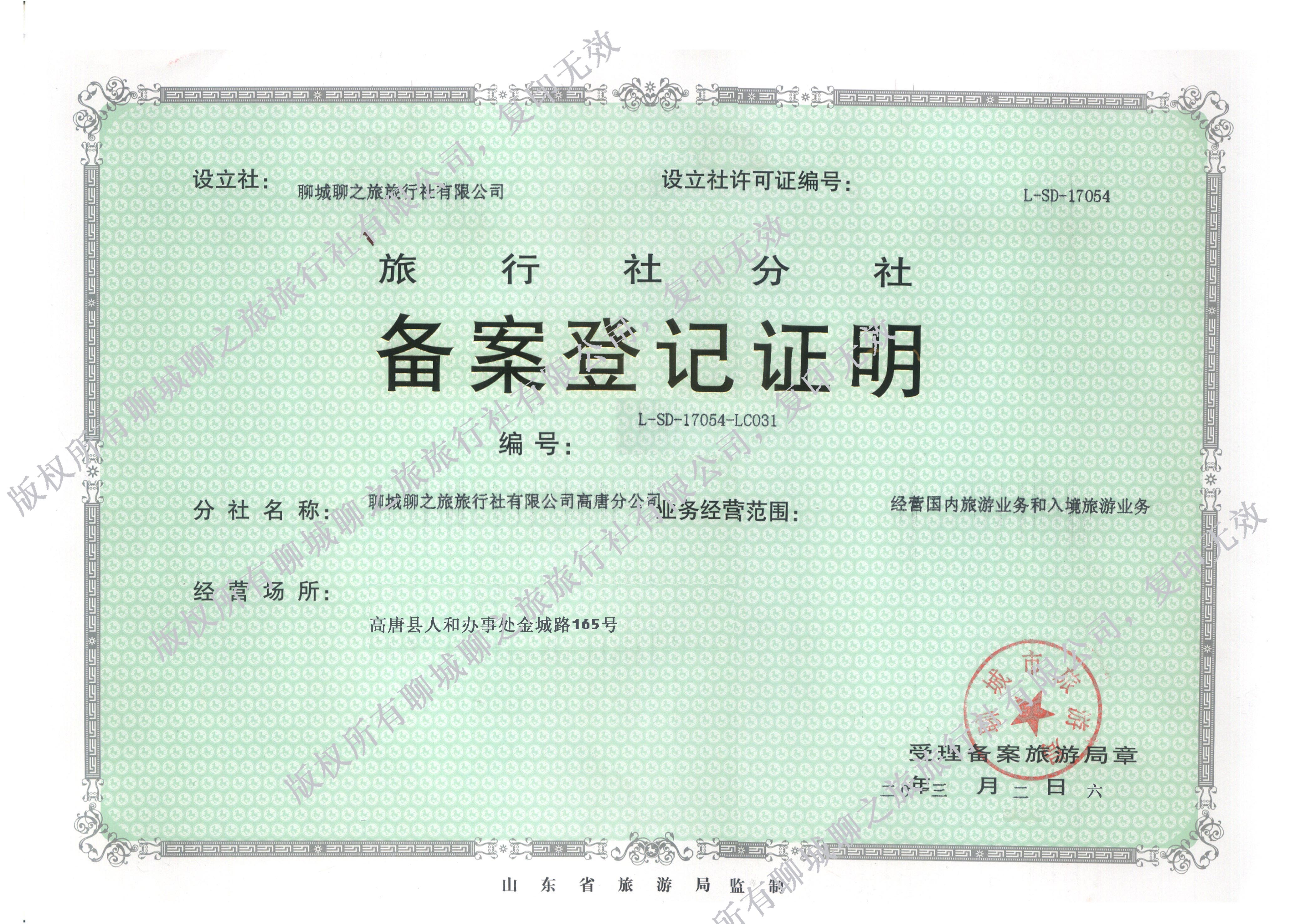 熱烈祝賀聊城聊之旅旅行社有限公司高唐分公司手續(xù)完畢
