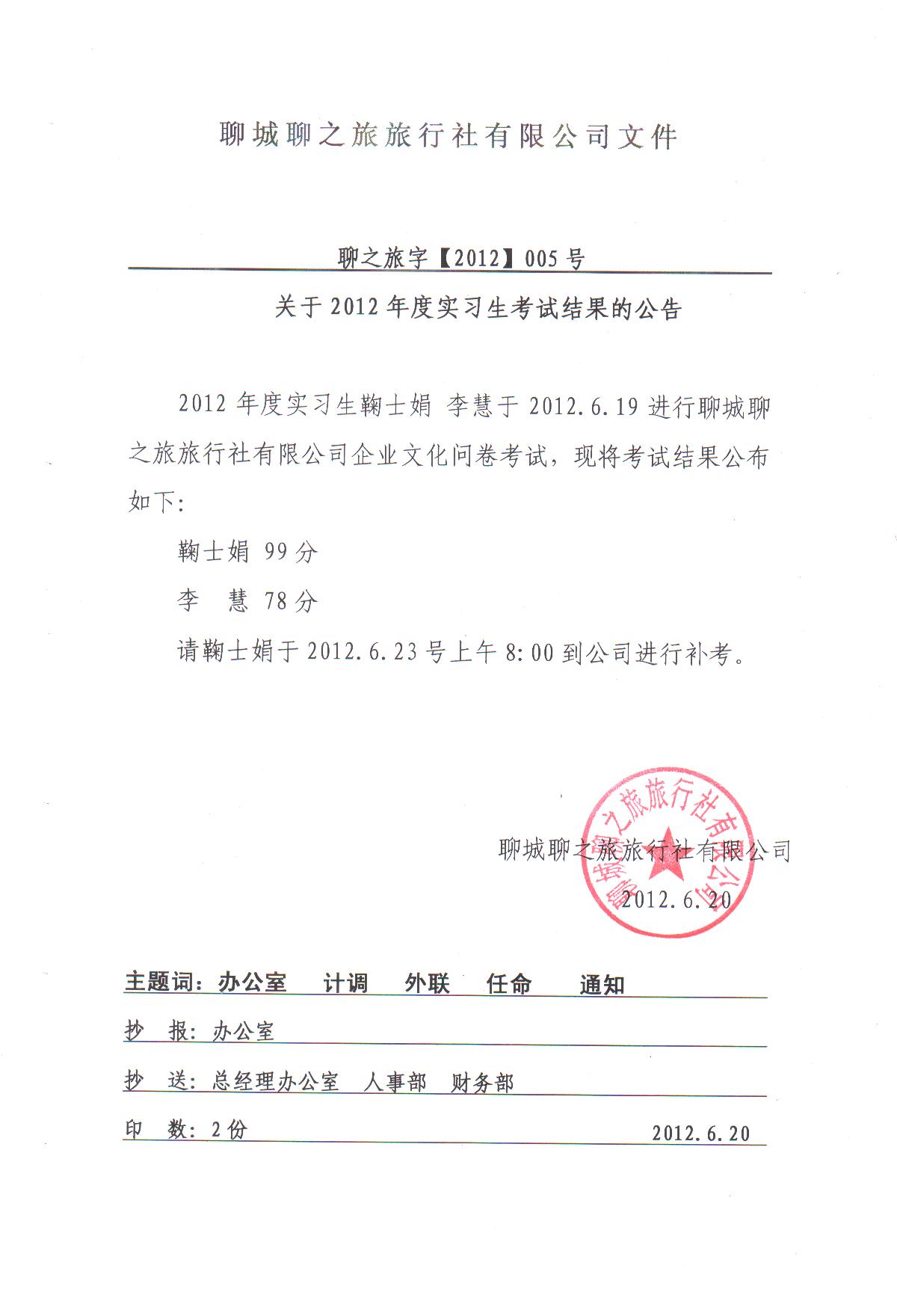 關(guān)于2012年度實習(xí)生考試結(jié)果的公告