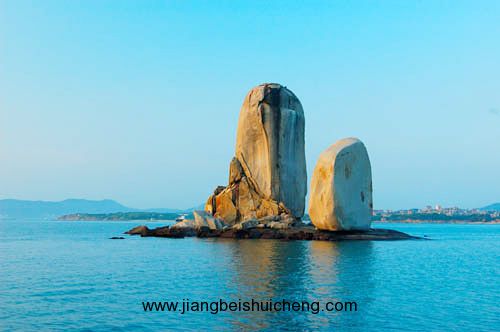 1.在平潭島西北看澳村西側(cè)500多米的海面,遠(yuǎn)遠(yuǎn)望去有一個(gè)圓盤狀的大礁石,托著一高一低的兩塊碑形海蝕柱。整個(gè)礁石象一艘大船兩塊巨石象兩面鼓起的雙帆,似乎正在乘風(fēng)破浪前進(jìn)。這是平潭最著名的自然景觀――石牌洋。又稱為“半洋石帆”和“雙帆石”。在其礁石底部是一組平坦完整的巖石。兩個(gè)石柱均由粗?;野咨幕◢弾r組成東側(cè)的一個(gè)高達(dá)33米,胸寬9米,厚8米,周長57米;西側(cè)的一個(gè)高17米,胸寬15米,厚8米周長39.9米。兩個(gè)石柱的底部都是近似四方形體,直立在礁石上。據(jù)地質(zhì)學(xué)家考證是世界上最大的花崗巖球狀風(fēng)化海蝕柱。