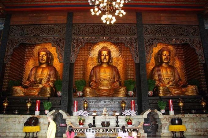 大接引寺的后面是佛光山寺廟建筑群。大雄寶殿居于各殿中間,殿內塑有高約7米的三尊大佛像,中為娑婆世界教主迦牟尼佛,右為西方極樂世界教主阿彌陀佛,左為東方琉璃世界教主藥師佛,均為盤膝坐蓮金身。大殿四壁上建有14600個佛龕,各龕均供奉一尊小佛像,佛前裝小燈,殿內14600個長明燈映著一尊大佛,版權所有,山東聊城聊之旅國際旅行社有限公司,轉載必究!金碧輝煌,其氣派令全臺所有佛寺殿堂都望塵莫及。位于大雄寶殿右面的是大悲殿,高20米,殿中供奉一尊高約7米、呈立姿手持凈瓶的觀音菩薩,殿堂四壁建有1萬個神龕,供奉1萬尊小觀音神像。滿殿盡是大慈大悲的觀音菩薩,故殿名又叫“萬佛大悲殿”。與大悲殿相對屹立的為大智殿,殿中供奉文殊菩薩,據(jù)傳他曾為眾生說法,故有“大智”之稱。佛光山還有“佛教文物陳列館”(大愿殿)和“凈土洞窯”(極樂世界)兩處“隱形式”建筑,以“凈土洞窯”為著名。所謂“凈土洞窯”即自山麓挖入山腹的地洞,右洞入,左洞出,內里形成“冂”形地道,布有1250個佛像以及傳道講經(jīng)等場景,洞壁塑繪有西方三圣等極樂世界的想象造型,在中國寺廟建筑中極為罕見。諸大殿建筑面積共達50多萬平方米,風格雖各不相同,宏偉莊嚴則一。