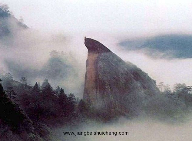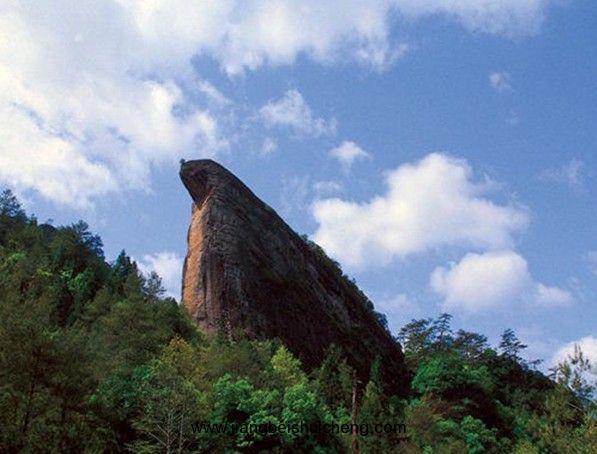從天車架往西行約數(shù)百米,便可看見一座形似雄鷹的巨巖。“雄鷹獨(dú)立健無倫,銳喙昂頭實(shí)逼真。豈是神山厭凡鳥,欲君奮擊絕器塵”。形象、生動(dòng)地描繪出了鷹嘴巖的雄姿。鷹嘴巖在章堂澗南側(cè),如一頭向東昂首的雄鷹,嘴中含(生)著一株刺柏,形象奇妙,是武夷九十九巖中最好的一景。鷹嘴巖北有丹霞嶂,處在章堂澗邊,壁上有洞,相傳太平天國(guó)時(shí),崇安城內(nèi)一富豪懼怕農(nóng)民起義軍對(duì)他清算,攜眷逃避來此,藏身洞中。后來他在洞中建造了樓閣,并裝上轆轤便于上下,人稱天車架。版權(quán)所有山東聊城聊之旅國(guó)際旅行社有限公司,轉(zhuǎn)載必究!今樓閣已荒廢,天車架也已不存,僅留遺跡供人觀看,成為一景。鷹嘴巖是一座渾然一體的巨巖,光禿禿的巖頂,東端向前突出,尖曲如喙。出奇的是,鉤形的“鷹嘴”上竟然生長(zhǎng)首一株枝干虬屈的古老刺柏,給鷹嘴增添了幾分飄逸,幾許神采,從巖頂直削而下的巖壁,光潤(rùn)瑩潔,白里透紅,而微微拱起的巖脊卻是一片蒼黑,隱隱約約地現(xiàn)出一條條裂紋,猶如豐滿的羽翼。佇立在章堂澗旁仰望鷹嘴巖,只見它兀立峰巔,翹首藍(lán)天,勢(shì)欲振翅高翔,搏擊蒼穹,無比雄偉壯觀。