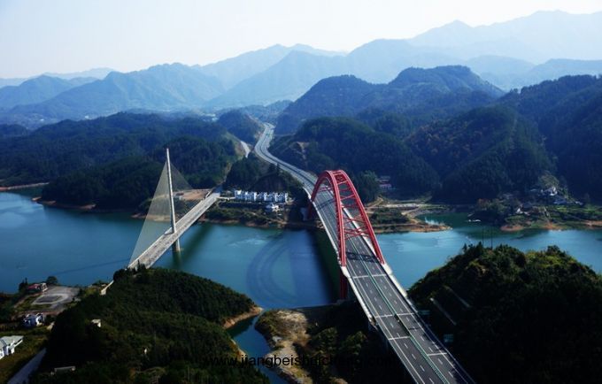 太平湖上,因?yàn)镚205國(guó)道和G3京臺(tái)高速跨湖的需要修建了2座大橋,位于G205國(guó)道上的為斜拉索大橋,而G3高速上大橋?yàn)橹谐刑峄@結(jié)構(gòu)。