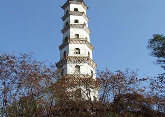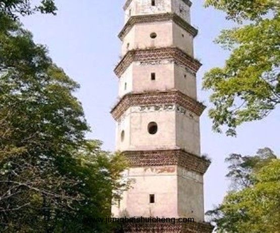 塔平面六邊形,底邊長3.9米,七層樓閣式磚塔,通高36米,塔身疊澀出檐。底層以及三至七層正面各開券頂門,二層各面相間開長方形、圓形窗,其余各層相間、上下相錯(cuò)開5個(gè)方形窗。塔頂六角攢尖。塔內(nèi)各層設(shè)木樓板和木樓梯。門額有阮元題刻的“秀發(fā)梧江”、“觀文成化”、“光射牛斗”等石匾。1982年維修,改木樓梯為鐵樓梯。