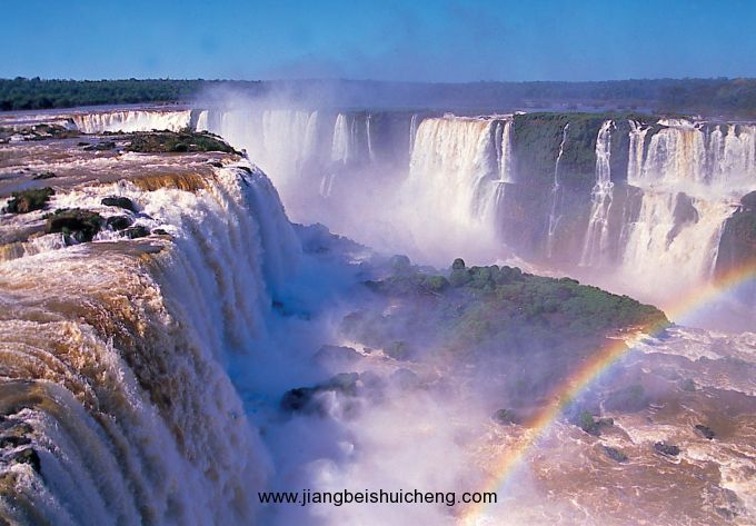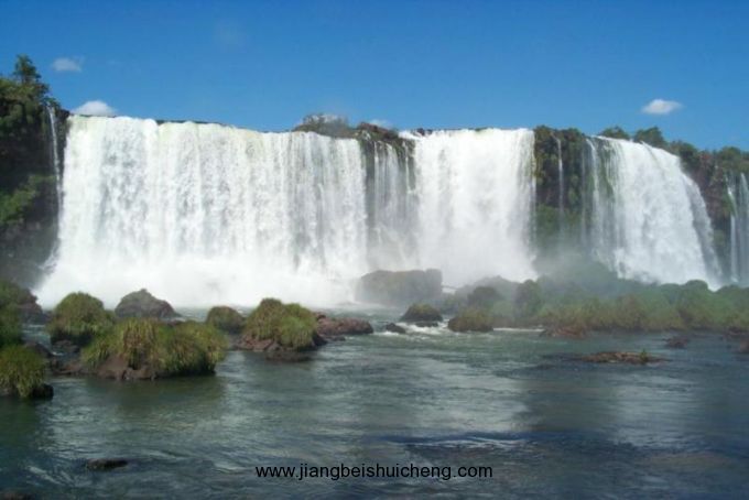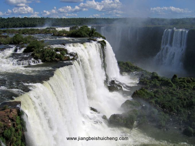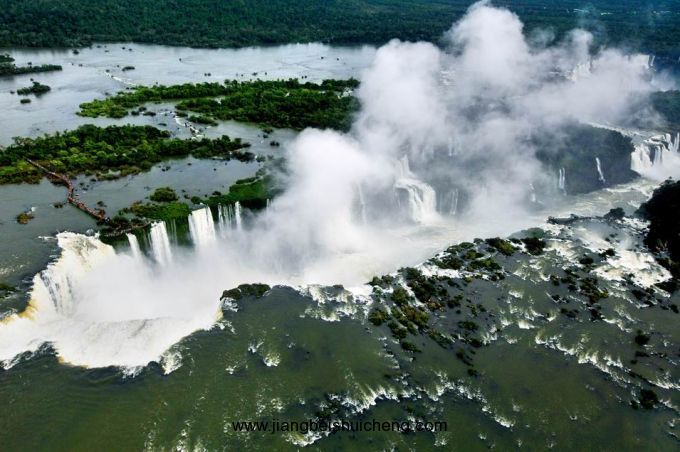 伊瓜蘇大瀑布,亦作Iguassu或Iguazu,西班牙語作Cataratas del Iguazu,葡萄牙語作Cataratas do Igua?u或Saltos do Igua?u,平均流量1,751立方米/秒,為馬蹄形瀑布,高82米(269呎),寬4公里(2.5哩),是北美洲尼加拉瀑布寬度的4倍,比非洲的維多利亞瀑布大一些。懸崖邊有無數(shù)樹木叢生的巖石島嶼,使伊瓜蘇河由此跌落時約分為275股急流或瀉瀑,高度60~82米(200~269呎)不等。該瀑布與伊瓜蘇河皆得名于一個意為「大水」的瓜拉尼語(Guarani) 詞匯。流入伊瓜蘇河。