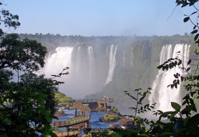 據(jù)說只有在巴西的那一側(cè)才可看清伊瓜蘇大瀑布的真面目,從阿根廷國家公園可直接乘坐小車到達巴西的瀑布公園,從這邊可以看到,對面的阿根廷國家公園整個是一座瀑布山,寬一千米以上,無比壯觀。