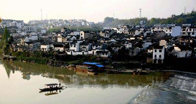 站在石壩上,舉首四望,氣象萬千,盡收眼底。壩上碧波如鏡,魚翔深潭,小舟撥浪,激起漣漪,恬靜安閑。壩下亂石嶙峋,浪峰咬石;西岸巍然屹立的紫陽山,林木蔥郁;建于明代的紫陽橋,宛若彩虹橫臥清波,此橋長(zhǎng)140米,高14米,寬10米,在歙縣城的三座古橋中最高、最寬,因橋的上游即為徽商行舟的碼頭,所以橋孔建得比一般橋要高大得多,以便行舟過帆。