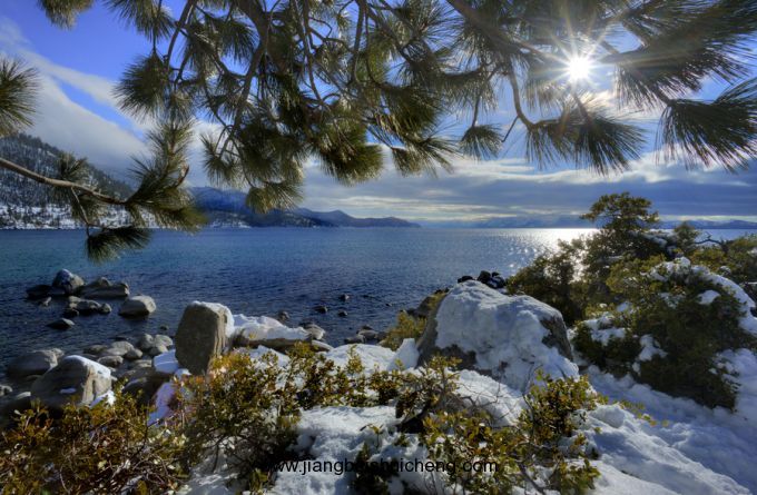 太浩湖是位于美國加州與內(nèi)華達州之間的高山湖泊,海拔6225 尺,22 哩長、12 哩寬,并有 72 哩長的湖岸,四周由山峰環(huán)抱,湖水澄凈湛藍,冬天降雪期長達 8 個月,路面經(jīng)常積雪盈尺,但湖底異常的深,最深處達1645尺,湖水卻不會結(jié)冰。