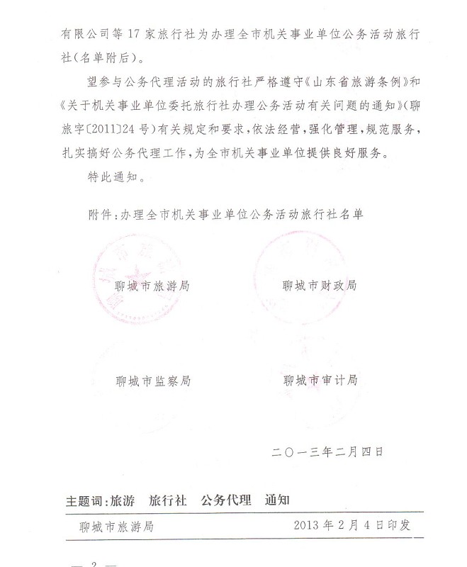 【網(wǎng)宣部】熱烈祝賀聊城聊之旅旅行社有限公司成為聊城市機關(guān)事業(yè)單位公務(wù)活動旅行社!