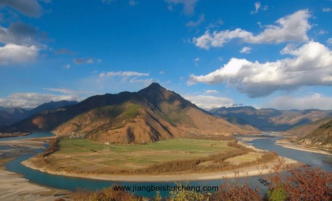 金沙江第一灣位于川滇藏三省區(qū)結(jié)合部的得榮縣子庚鄉(xiāng)境內(nèi)。由北向南縱貫全境的定曲河,在先后接納了瑪伊河和碩曲河之后,攜三江之水投入了金沙江的懷抱,在江水匯合處,形成“三壁夾兩江”的奇景。穿山越谷而來的金沙江,由此水勢更加浩蕩,峽谷逐漸開闊,在即將沖出這川滇要塞之時(shí),它似乎想先舒緩一下長途奔波的疲勞,于是放慢腳步,圍繞著金字塔般的日錐峰瀟灑地畫了一個(gè)“Ω”字形的大拐彎。孰料這不經(jīng)意的即興之作,竟成就了一處奇觀。