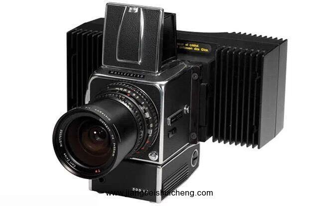 圖中這臺(tái)安置在一臺(tái) Hasselblad 500EL 相機(jī)上??膳臄z黑白照片,或者通過鏡頭前固定的機(jī)械化過濾器轉(zhuǎn)輪分別用紅、綠、藍(lán)色三片濾鏡曝光后再合成一幅全彩照片。