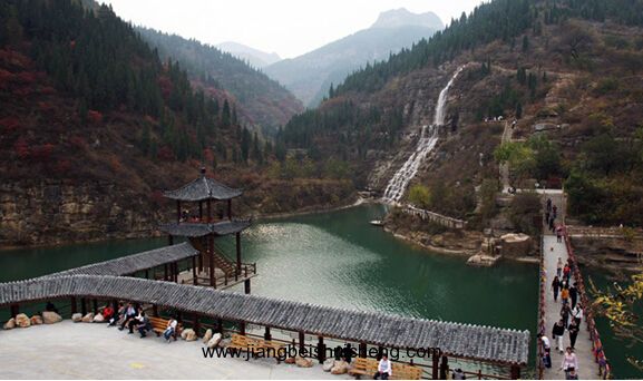 進(jìn)入山門,景區(qū)2公里的引導(dǎo)區(qū)域可乘旅游觀光車游覽,沿途懸崖峭壁,怪石林立,崖壁之上,或如人面,或如牛首,千姿百態(tài),惟妙惟肖。古松虬枝倒掛溪流兩岸,黃綠交融,相映成趣,青石小院點(diǎn)綴其間,構(gòu)成了一幅神奇的天然畫卷。游人所到之處,仿佛走進(jìn)了夢(mèng)境,無(wú)不驚嘆大自然的神功鬼斧。觀光車的盡頭是景區(qū)小廣場(chǎng),此處是游客休憩駐足之處,從這里出發(fā)景區(qū)的游覽才算是正式開始。錯(cuò)落有致的三個(gè)形態(tài)迥異的瀑布吸引了游客的注意力,三合瀑、水簾瀑和歡喜瀑?gòu)膽已虑捅谏媳紴a而下的瀑水,猶如千軍萬(wàn)馬,層層飛瀉,聲勢(shì)浩蕩。游客從水簾洞中穿過(guò),頭上瀑布如雷鳴乍響,外面瀑布猶如水注,通過(guò)石壁水簾觀覽山中風(fēng)景別有韻味。
