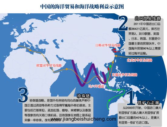 印度洋是中國(guó)重要的國(guó)際貿(mào)易通道和能源通道。首先是能源安全。自1993年中國(guó)成為石油凈進(jìn)口國(guó),截至2009年,中國(guó)已成為僅次于美國(guó)和日本的第三大石油進(jìn)口國(guó),進(jìn)口量超過(guò)2億噸,日均超過(guò)380萬(wàn)桶,已占整個(gè)石油需求量的60%,未來(lái)的需求量還會(huì)繼續(xù)攀升,而國(guó)內(nèi)產(chǎn)量到2020年將開(kāi)始下降。據(jù)羅伯特??ㄆ仗m估計(jì),到2020年中國(guó)的石油需求量將達(dá)到日均730萬(wàn)桶。目前中國(guó)石油進(jìn)口量的80%來(lái)自中東和非洲,經(jīng)印度洋和馬六甲海峽等通道運(yùn)至中國(guó)。雖然中國(guó)也在積極爭(zhēng)取石油進(jìn)口多元化,但原油儲(chǔ)量占世界60%、天然氣儲(chǔ)量占世界35%的印度洋地區(qū)仍是中國(guó)最可靠的石油進(jìn)口地區(qū),到2020年超過(guò)85%的石油進(jìn)口量要走印度洋航線,印度洋和馬六甲海峽地區(qū)的安全影響著這條事關(guān)中國(guó)經(jīng)濟(jì)命脈的“海上生命線”,因此被稱為中國(guó)的“馬六甲困局”。由于中國(guó)奉行和平發(fā)展戰(zhàn)略及限于自己的海軍力量,在非和平時(shí)期,中國(guó)對(duì)保障這條“海上生命線”還存在很大的困難。據(jù)統(tǒng)計(jì),中國(guó)現(xiàn)在的戰(zhàn)略石油儲(chǔ)備量不足30天,而國(guó)際能源署建議的儲(chǔ)備標(biāo)準(zhǔn)是90天,美國(guó)和日本等國(guó)的儲(chǔ)備量超過(guò)160天,其他發(fā)達(dá)大國(guó)也遠(yuǎn)超90天。一旦爆發(fā)危機(jī),中國(guó)就有可能受制于人。同時(shí),印度洋地區(qū)沿岸國(guó)家大都屬于礦產(chǎn)資源豐富的欠發(fā)達(dá)國(guó)家,由于技術(shù)和資金短缺,這些礦產(chǎn)資源基本上屬于未開(kāi)發(fā)、半開(kāi)發(fā)或開(kāi)發(fā)水平不高的狀態(tài)。隨著中國(guó)國(guó)內(nèi)資源的日益枯竭,印度洋地區(qū)的各種礦產(chǎn)資源,如銅、鋰、鈹、鎳、鈷及磷酸鹽等都是中國(guó)現(xiàn)在或未來(lái)所需的,因此中國(guó)有必要與這些國(guó)家合作以保證印度洋航線的安全。