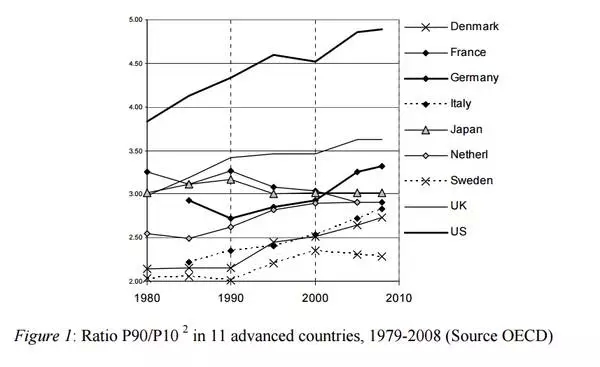 最近30年,英美等發(fā)達(dá)國家的高收入群體和低收入群體收入都有所增長,但是高收入群體(政企管理者、金融從業(yè)者、IT從業(yè)者)的收入增長更快。