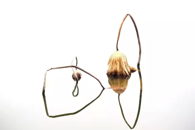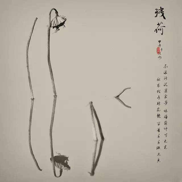 利用水中倒影來表現殘荷,使其增添一份凄清真實中帶著虛幻的味道。