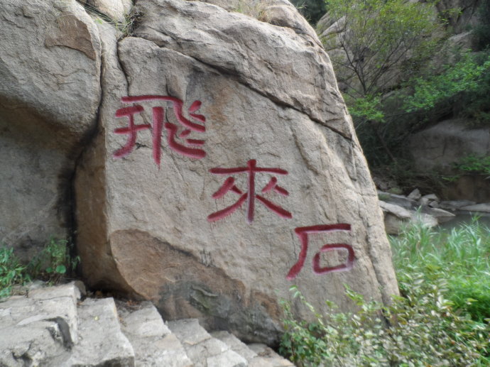 上個(gè)世紀(jì) 70年夏季的一個(gè)中午,一聲響雷過后,左側(cè)山崖上方40米處的一塊巨石被震落下來,落于山澗之中,稱為飛來石。