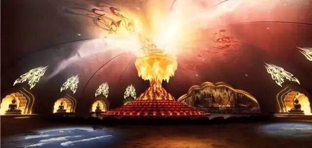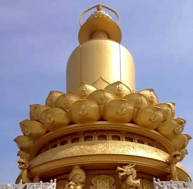 山東省濟(jì)寧市兗州區(qū)興隆文化園(大興隆寺)景區(qū)內(nèi),有一座宏偉的靈魂中心建筑——高達(dá)118米的靈光寶殿,共分九層。上部金瓶聳然矗立在金蓮花須彌臺(tái)上,氣勢雄偉、莊嚴(yán)神圣,其中安奉著興隆塔地宮出土的世尊金頂骨真身舍利;下部借鑒了釋迦牟尼壇城的形制,氣勢磅礴象征佛祖的智慧浩瀚無邊與獨(dú)特深厚的佛教壇城理念交相輝映。