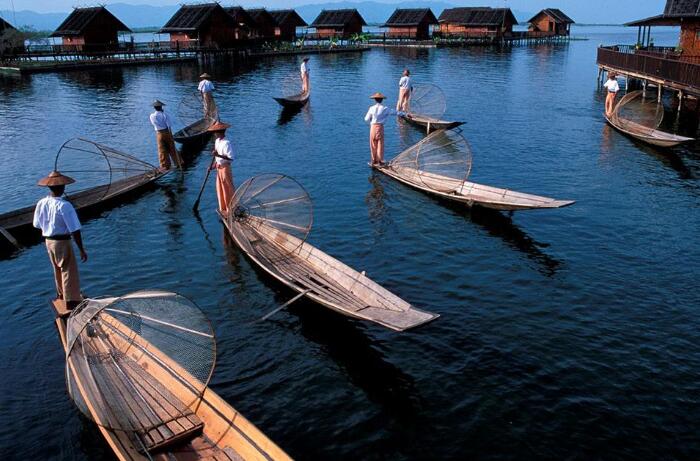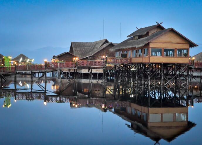 飯店內(nèi)早餐后,乘坐當(dāng)?shù)靥厣未斡[風(fēng)光旖旎的茵萊湖。茵萊湖是緬甸第二大湖,三面環(huán)山,水質(zhì)清澈,湖底水草清晰可見,湖水的顏色隨著每天日出日落而發(fā)生變化。當(dāng)?shù)匾疬_(dá)族人的村寨依湖而建,高腳屋、學(xué)校、商店等各種生活設(shè)施均佇立水中,當(dāng)?shù)厝说娘嬍称鹁泳篮?,交通往來全依靠船只,是名副其?shí)的水上村寨。當(dāng)?shù)厝颂赜械膭澊绞绞钦驹诖玻帜_并用的劃船。乘船參觀坐落在湖上的【水中佛塔】,在此可以欣賞俗稱【貓?zhí)?/strong>】的【波道烏寺】中的緬甸貓?jiān)谒轮猩说挠?xùn)練下,可以為游人表演鉆圈,寺中的五世佛像是艷麗湖的至尊,寺中的佛塔金光燦燦,全寺全部由柚木建成,木雕技藝精湛,其本身就是一座藝術(shù)寶庫(kù);參觀水上【手工織布制衣作坊】、【卷煙作坊】、【鐵器生產(chǎn)作坊】,與【長(zhǎng)頸族家庭】拍照,參觀當(dāng)?shù)孛恐芤淮蔚募小?strong>水上市場(chǎng)】,領(lǐng)略緬甸獨(dú)特的水上村寨生活。午餐在風(fēng)光奇美的【水上餐廳】用餐,品嘗湖中的特產(chǎn)魚。晚入住水邊的木屋別墅。