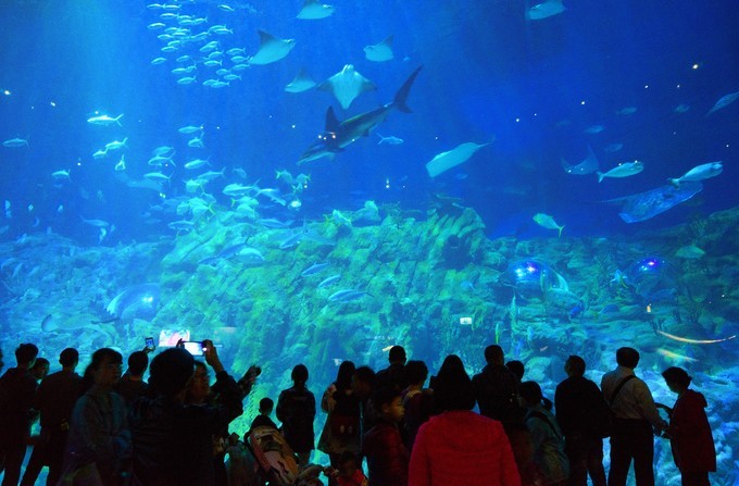 鯊魚館,我印象最深刻的展館,沒有之一??催^了國內(nèi)好幾個地方的海洋館,這里的鯊魚是我見過種類最多、數(shù)量最多、個頭最大、看起來最“嚇人”的。而且展館的建筑設(shè)計很科學(xué),從水面螺旋向下,方便游客參觀所有高度上的鯊魚。逛這個館的時候,館里統(tǒng)共十個人不到。絕對值回票價,想看多久看多久,不用擠來擠去看人頭。為什么呢?那是因為大家全部都涌去看海洋劇場最早的11:30那一場表演了。那個時間點左右,我們好像穿越到了一個無人的公園,徹底享受了一把超級vip的待遇。可惜當時不知道,沒去再玩幾個排隊的項目,等到這短短半個小時左右的時間紅利一過,后面又恢復(fù)到處都排隊的狀態(tài),一直持續(xù)到離園。
