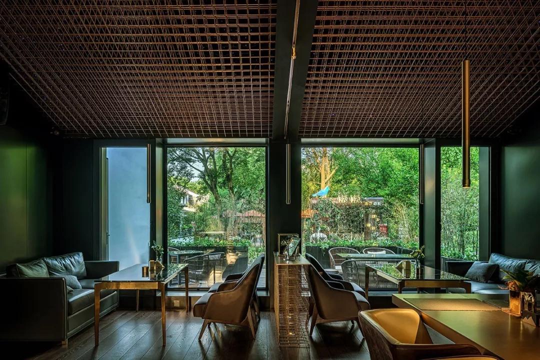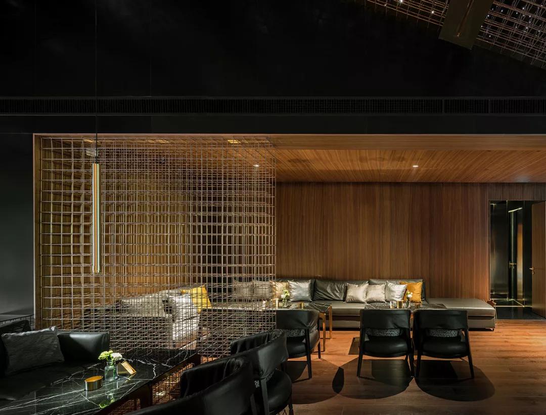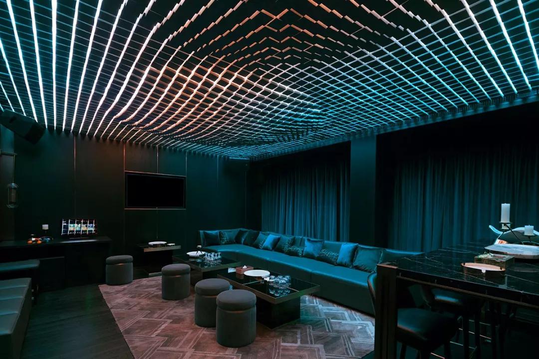 酒吧區(qū)域是一個動態(tài)空間,室內(nèi)的現(xiàn)代化裝飾則與外界古色古香的建筑群形成強烈對比,數(shù)字化設(shè)計的黃銅立體網(wǎng)格結(jié)構(gòu)貫穿室內(nèi),將酒吧的各個空間串聯(lián)在一起。延伸的吧臺、舞動的頂面、變換的星空頂燈制造出不同的視覺感受,引導(dǎo)人逐個探索每一個角落。酒吧區(qū)沒有采用尋常酒吧中常見的電視、投影設(shè)備以最大程度減少對人的擾動,營造一個可以靜思、可以真正意義上產(chǎn)生思想碰撞的空間。KTV舞動的頂面造型設(shè)計以數(shù)字矩陣為靈感,也是虛擬未來的象征。不同模式的燈光演繹讓音樂在這有了實體的呈現(xiàn)方式,音樂的流動可以被視覺捕捉,活躍了整體空間的同時也增加了多感官交流。