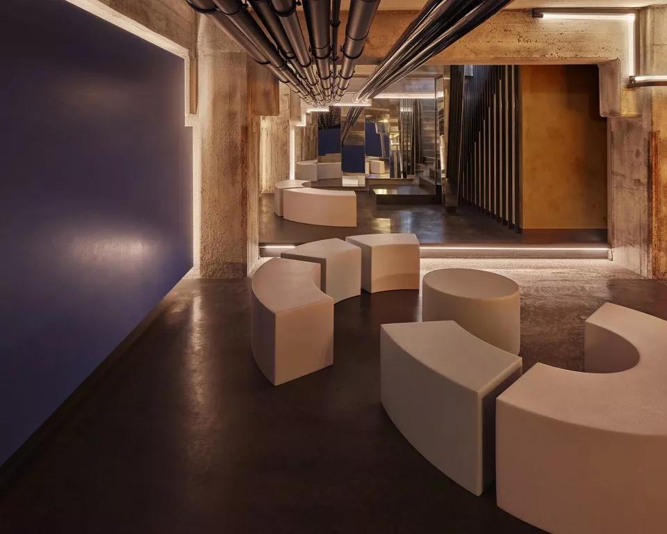 室內(nèi)的定制家具和精致的配色方案受到了陶瓷生產(chǎn)過程的啟發(fā):空間中的藍(lán)色、灰色、粉紅色和黃色涂料呼應(yīng)了生產(chǎn)工藝的開端,利用水和黏土塑造出類似于陶器模具的體量。陶器模具的形狀以及用于生產(chǎn)陶器的工具被再次利用,成為造型獨特的工業(yè)吊燈,并將室內(nèi)空間劃分為不同的區(qū)域。堅硬的幾何形狀與柔軟黏土塑造出的形體共同構(gòu)成了大膽而和諧的內(nèi)部空間。