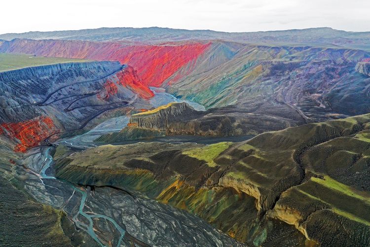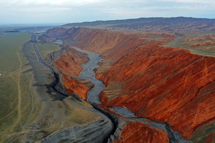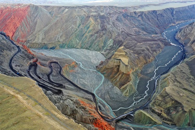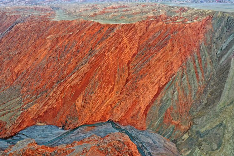 紅山大峽谷,位于新疆奎屯市安集海河流域,也稱安集海大峽谷。是兵團(tuán)農(nóng)七師紅山煤礦所在地。峽谷最深處約400米。縱橫交錯(cuò)的溝壑,從峽谷邊緣一直延伸至谷底,形成險(xiǎn)峻的“山峰”?!吧椒濉本缮笆湍嗤两M成,高則百米,猶如一把把利劍,“鋒芒”直指蒼穹。大峽谷以其險(xiǎn)、奇而著稱,刀削斧劈的崖壁,蜿蜒曲折的流水,氣勢(shì)磅礴的深谷,色彩斑斕的奇石,以及象小甲蟲(chóng)似的運(yùn)煤卡車(chē)從谷底緩慢盤(pán)轉(zhuǎn)在陡峭彎曲小道上,象一個(gè)個(gè)跳動(dòng)的音符,無(wú)不給幽深的峽谷增加了些許生機(jī)。