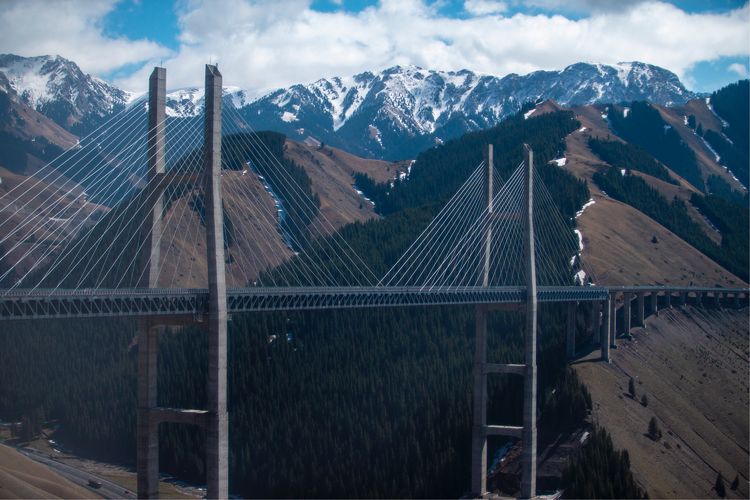但是,新疆面積雖大,但卻大部分都是山、沙漠、戈壁灘和河流湖泊。阿爾泰山雨雪豐富,森林密布,草原繁茂。橫亙新疆中部的天山山脈,峰巒重疊、氣派雄偉,總長2500公里。昆侖山脈山勢高聳巍峨,平均山脊線海拔超過5000米,最高的喬戈里峰海拔8611米,位于中國與巴基斯坦邊界上,為世界第二高峰。不到新疆, 不知道新疆之大。我們這次從天山西麓的伊犁地區(qū)經(jīng)庫爾勒到喀什以及到離巴基斯坦國境線僅130公里的塔縣,一路上山峰層疊連綿不斷,山頂白雪皚皚,或高聳入云,或白沙流淌。千姿百態(tài)的湖泊象一粒粒寶石鑲嵌在崇山峻嶺之中,或清澈見底,或冰封玉潔。