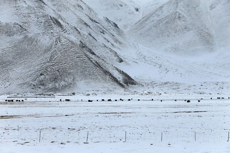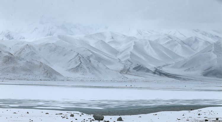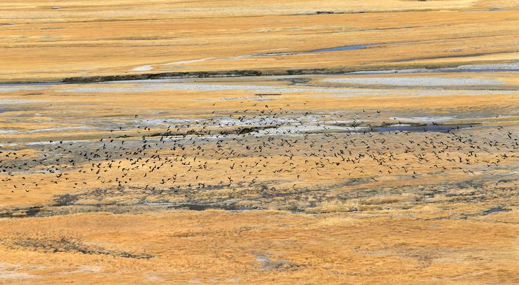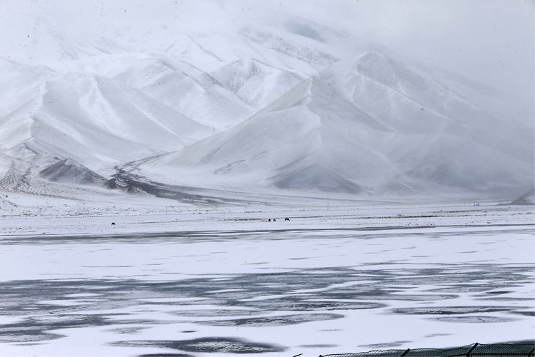 我們經(jīng)過時,大部分湖面還被冰雪覆蓋,部分湖邊呈現(xiàn)出藍(lán)色的湖水,引來許多鳥類覓食。