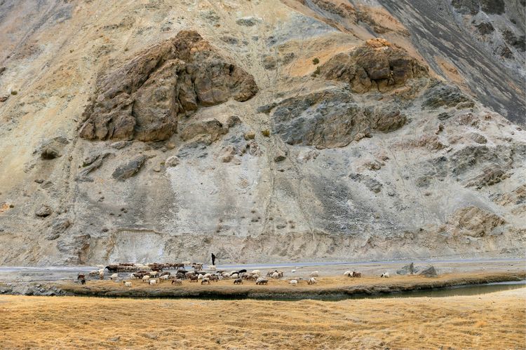 在本次的拍攝行程中,使我體會最深的一句攝影名言就是“好風(fēng)景都在路上”。新疆這么遙遠(yuǎn)廣闊,整天的行程基本上都是在車和飛機(jī)上渡過的,沿路風(fēng)光變幻萬千,瞬間即逝。大巴雖是專車,但也不像自駕車那樣隨意停車拍照。這就靠在行駛的車中拍攝。好在新疆車輛限速很嚴(yán),大巴一般限速在40-60公里之間。是車中隨拍變?yōu)榭赡?。隔著車窗雖使照片質(zhì)量變差,但總比沒有強(qiáng)。況且拍的內(nèi)容主要是村莊、人群、牛羊之類紀(jì)實(shí)照片,對畫質(zhì)要求不像風(fēng)光片那樣嚴(yán)。最好使用連拍速度較快的單反相機(jī),快門速度放在500—1000分之一秒,始終拿在手中隨時拍攝。密切監(jiān)視前方隨時即將到來的素材,將相機(jī)對準(zhǔn)與車窗玻璃呈90度角的地方,待素材闖入鏡頭的一瞬間按下快門。雖然這種拍攝成功率很低,但說不準(zhǔn)也能拍到別人拍不到的鏡頭,回來通過整理所拍照片,發(fā)現(xiàn)挑選出來的有一部分就是靠這種抓拍的方式取得的。