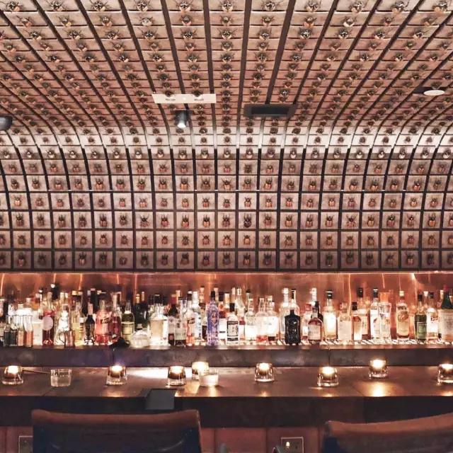 J.Boroski 其實(shí)跟 The Iron Fairies 一樣,出自 Ashley Sutton 和 Joseph Boroski 之手??臻g格調(diào)更時(shí)尚和華麗,但最讓人震撼的吧臺(tái)后面整面墻的甲蟲裝飾一眼就能看出是他的設(shè)計(jì)。