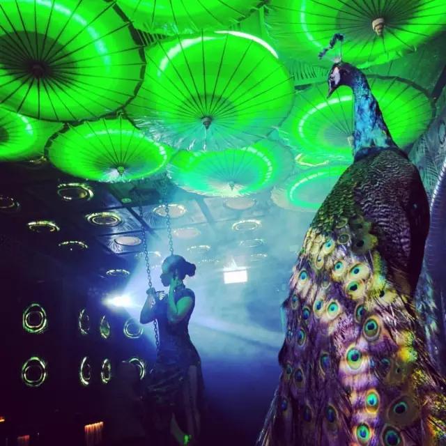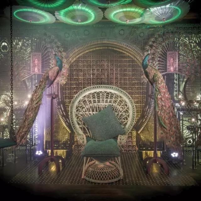穿過一間鳥舍就來到奇幻的 Ophelia。以孔雀和鴉片館為靈感,奢靡,優(yōu)雅,震撼都不足以形容這里的東方風(fēng)情。中式的庭院,鐵鑄的玄關(guān)、孔雀羽毛制的壁燈和翠綠的天鵝絨沙發(fā),設(shè)計(jì)師仿佛在用搭建電影場(chǎng)景的方式設(shè)計(jì)酒吧。