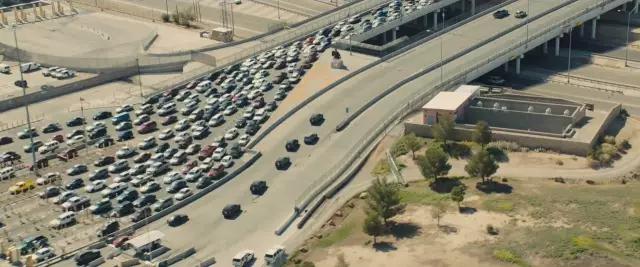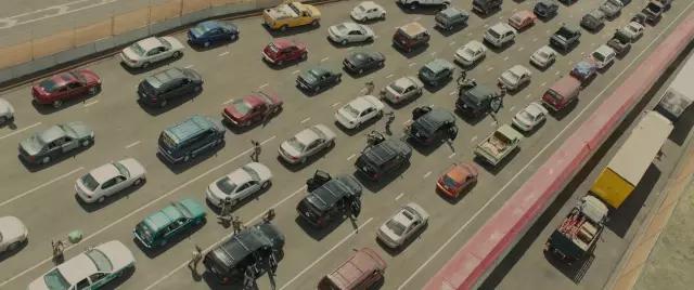 AC:電影前20分鐘是一段非常有沖擊力的片段,Emily Blunt飾演的角色和她的隊(duì)伍開進(jìn)華雷斯(邊境城市)。這個(gè)片段里混合航拍鏡頭和在車上的鏡頭,展現(xiàn)他們?cè)竭^邊境
