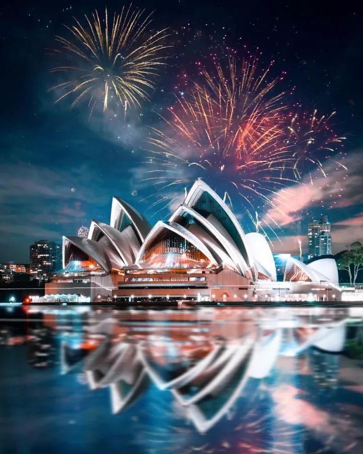 拍攝澳大利亞悉尼歌劇院,采用中景拍攝,將歌劇院特有的帆造型展現(xiàn)在觀者面前,感受建筑設計的獨特魅力,夜空中綻放的煙花讓畫面更有趣味性,烘托出熱鬧的氛圍。