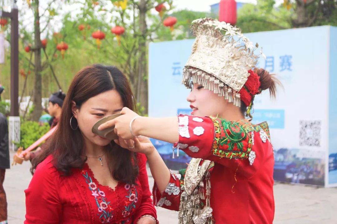 穿著盛裝的苗族姑娘們,端起小酒杯,邊舞邊唱,一時(shí)間敬酒歌四起。