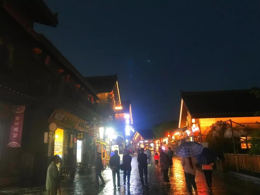 街道上的店鋪打開(kāi)了燈光,遠(yuǎn)遠(yuǎn)望去,人們的熱情絲毫沒(méi)被雨水澆冷,大家或許和我一樣,貪戀小鎮(zhèn)的夜色吧。
