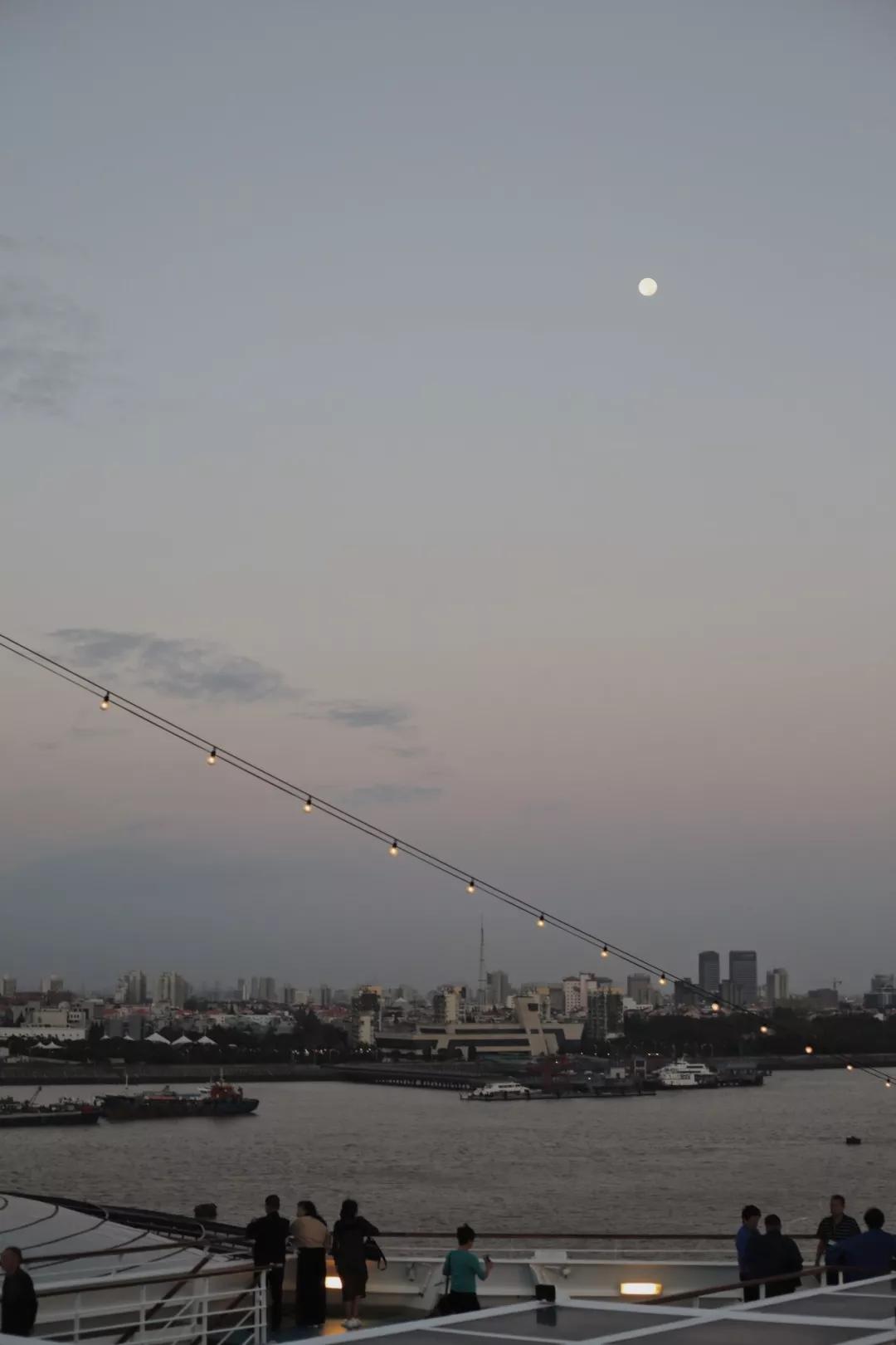晚餐過后,登上甲板眺望茫茫大海。高懸的圓月穿透薄云,在海天相交處灑下一道朦朧的錦緞。浪花層層翻卷,交疊耳語,耳邊明明有起伏的風聲,心里仍覺得萬籟俱寂,恍然從遠方涌起德彪西寧靜的和弦。