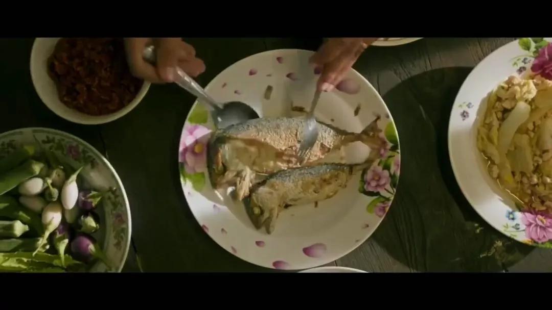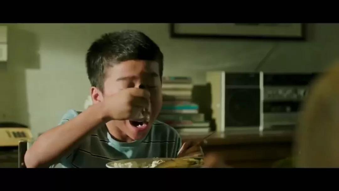 片子的開始母親把餐桌上最好的菜,夾起放進(jìn)了孩子的碗中,孩子吃得很香。