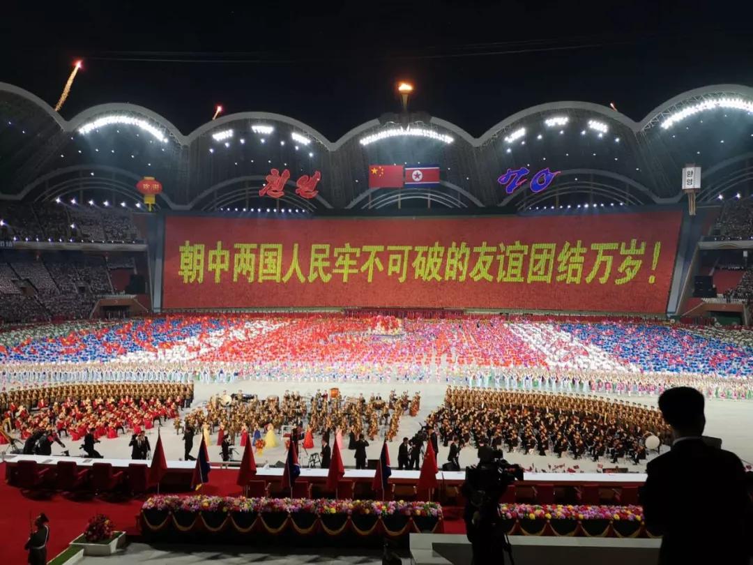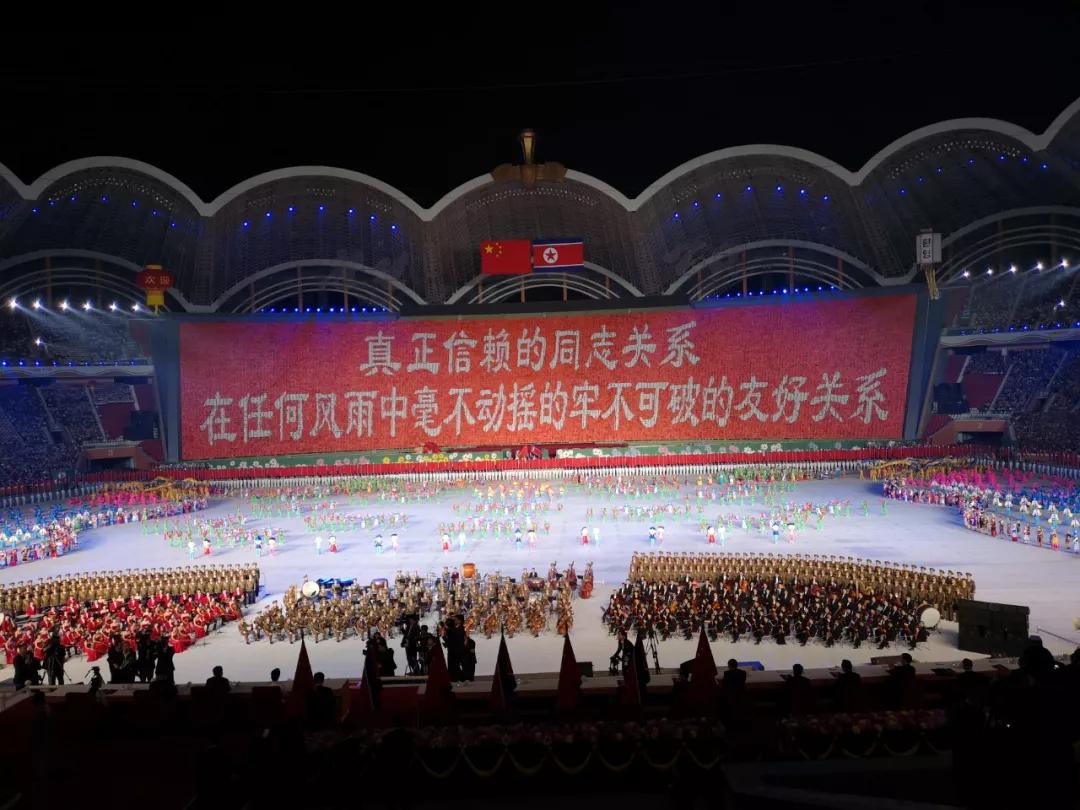 當晚,能容納10萬余人的“五一”體育場座無虛席?!盁崃覛g迎習(xí)近平總書記同志和彭麗媛女士”、“平壤-北京”等標語格外醒目。