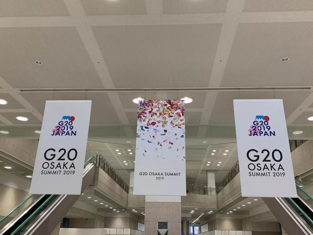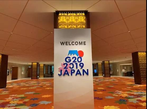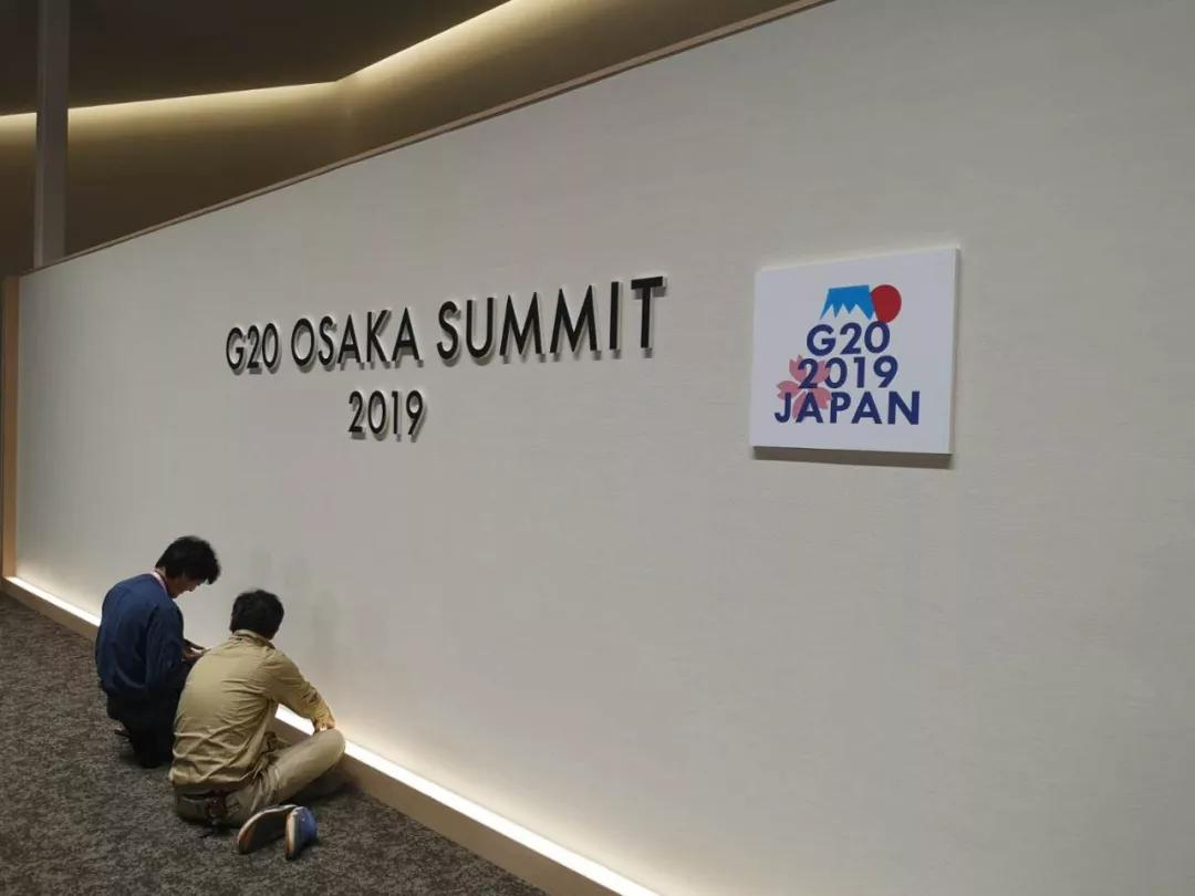 大阪麗嘉皇家酒店內(nèi),帶有二十國(guó)集團(tuán)領(lǐng)導(dǎo)人大阪峰會(huì)會(huì)標(biāo)的迎賓牌格外醒目。