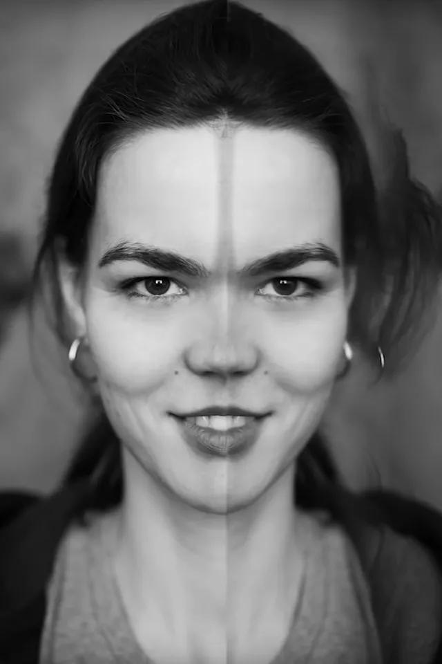 你也可以另辟蹊徑,不追求完美對稱——讓鏡面和臉部對稱軸重合,轉(zhuǎn)而在特殊的地方創(chuàng)造對稱面,同樣能收獲很有趣的照片: