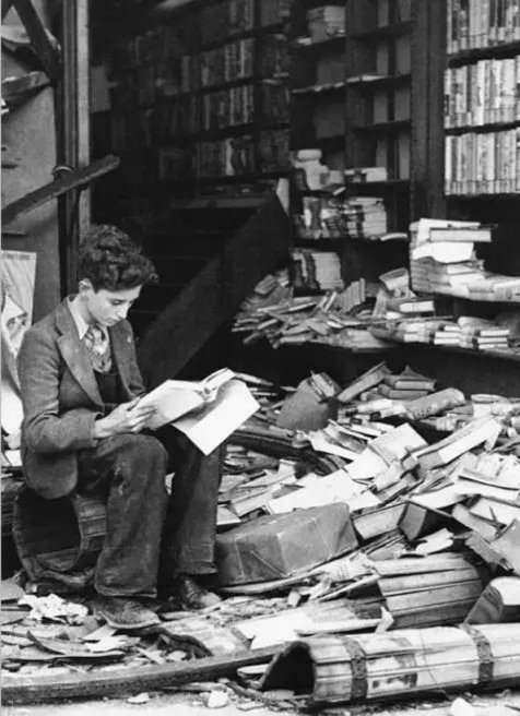被炸毀的書店里,書籍散落了一地,一片狼藉里,一個(gè)少年正坐在那安安靜靜地看著一本書。