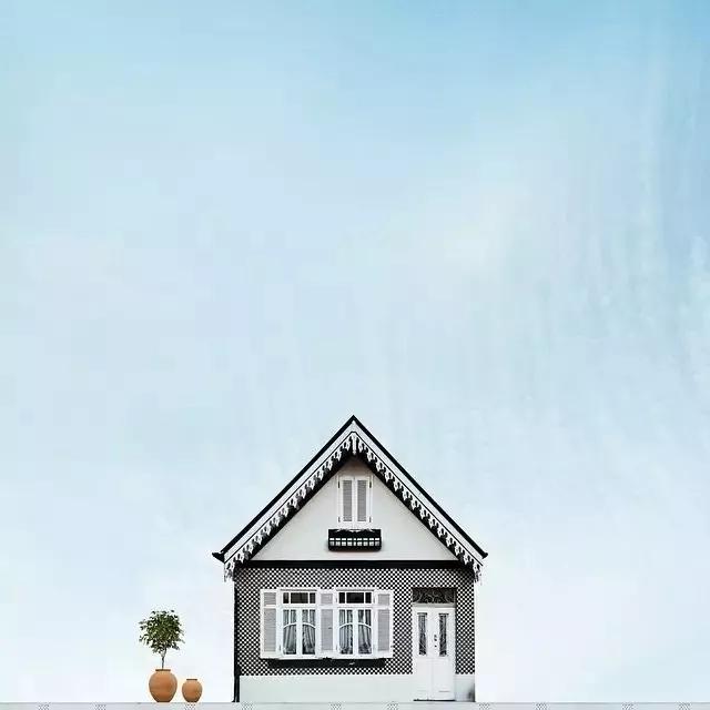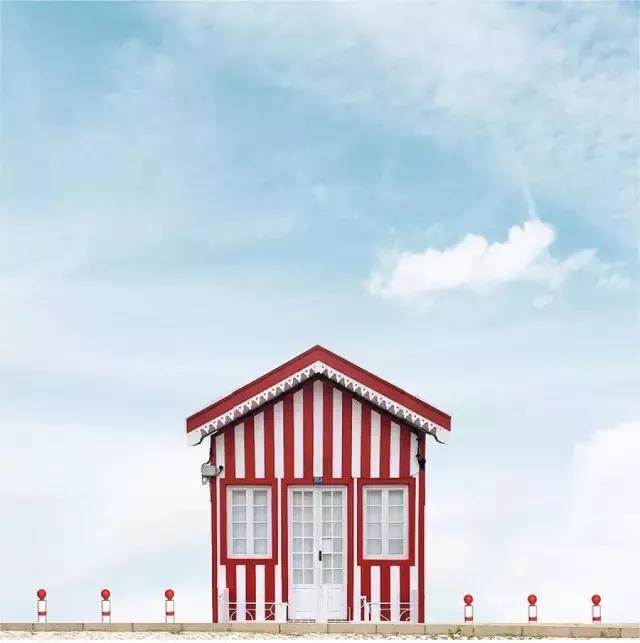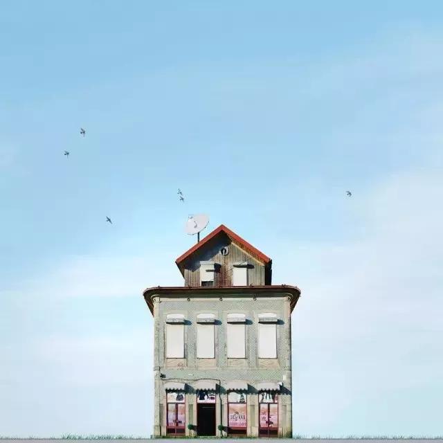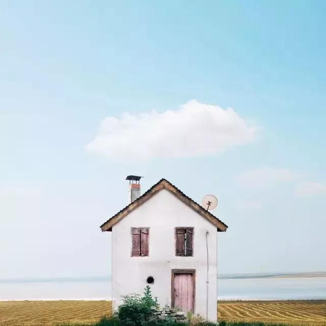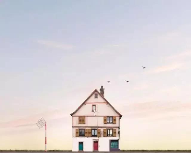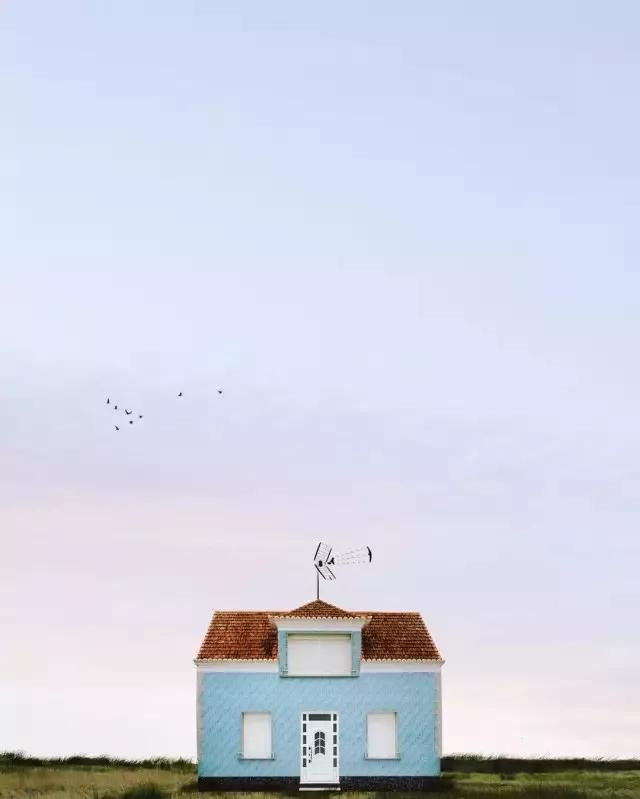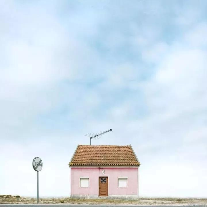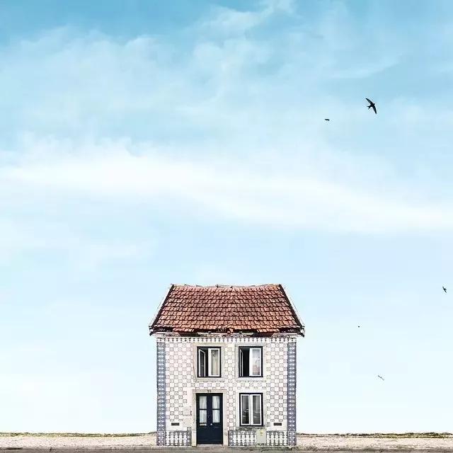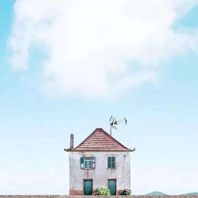 他的拍攝風(fēng)格統(tǒng)一,偏愛極簡構(gòu)圖,多以藍天白云為背景,畫面的主角則是一座小房子。