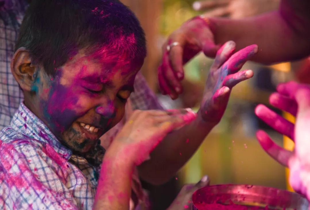2019 年3月19 日,在印度孟買一所學(xué)校,孩子們慶祝即將到來(lái)的灑紅節(jié)。