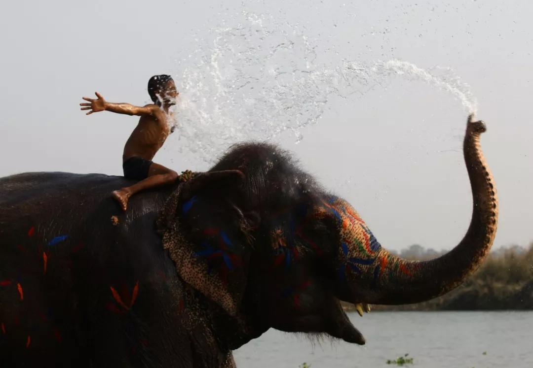 2018 年12月27日,在尼泊爾奇特旺,一名兒童在大象節(jié)上和大象戲水。第十五屆尼泊爾大象節(jié)正在奇特旺的索拉哈鎮(zhèn)舉行,活動(dòng)旨在推廣當(dāng)?shù)芈糜螛I(yè)并增強(qiáng)人們對(duì)野生動(dòng)物的保護(hù)意識(shí)。