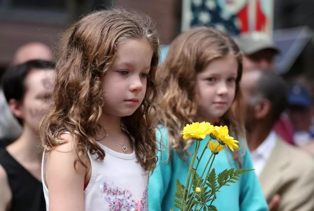 2017 年8月13日,在美國(guó)芝加哥,一名小女孩手持鮮花參加紀(jì)念活動(dòng)。數(shù)百名芝加哥市民13日聚集在市中心的聯(lián)邦廣場(chǎng),為美國(guó)弗吉尼亞州夏洛茨維爾市暴力事件受害者舉行紀(jì)念活動(dòng)。