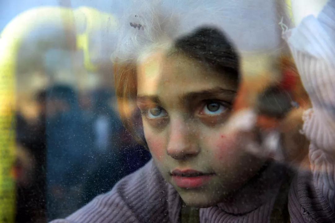 2018 年3月15日,在敘利亞大馬士革東郊,一名女孩乘車前往政府軍控制區(qū)安置點(diǎn)。敘利亞政府軍 15 日在首都大馬士革東郊東古塔地區(qū)收復(fù)一處要地,當(dāng)?shù)財(cái)?shù)千被困平民撤離。