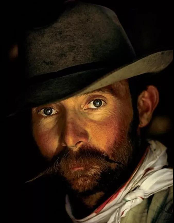 人像通常使用柔光拍攝,這樣可以令模特放松,柔化紋理,并讓模特的眼睛產(chǎn)生交流。在這張令人難忘的人像作品中,光線扮演了主角,將觀眾的視線引至牛仔的雙眼,光線來自側(cè)面,剛剛能夠照亮牛仔的帽子,對高光區(qū)曝光,而非陰影區(qū)。
