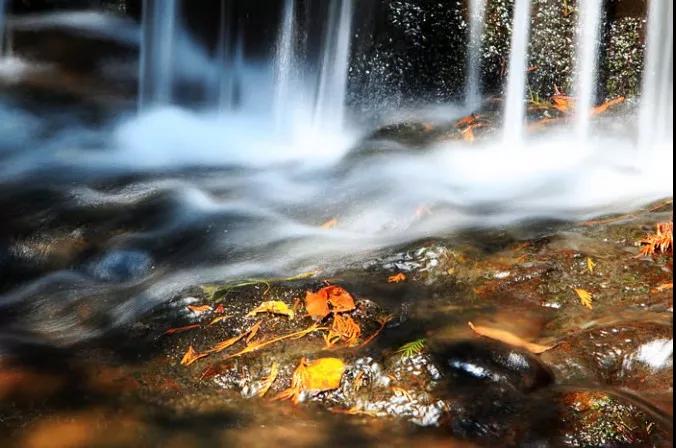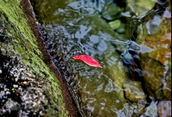在這張照片中,紅色的樹葉落于溪流之上,打破了畫面的整體,雖然是落葉流水,但定格下的畫面令人難忘。占據(jù)支配地位倒映著青綠色苔蘚的流水中,紅色起到了平衡的作用。